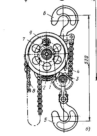 1 – стальний корпус; 2 – двохступенева зубчаста передача; 3 – вантажна зірочка; 4 – вантажний ланцюг; 5 і 6 – гаки; 7 – тягове колесо; 8 – тяговий ланцюг; 9 – гвинтове гальмо.
