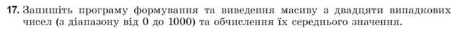 const n=12; var A: array [1..n] of integer; i: integer; sum,s: real; begin randomize; Writeln('Елементи'); for i:= 1 to n do begin a[i]:= random(1000); write(A[i], ' '); end; writeln;