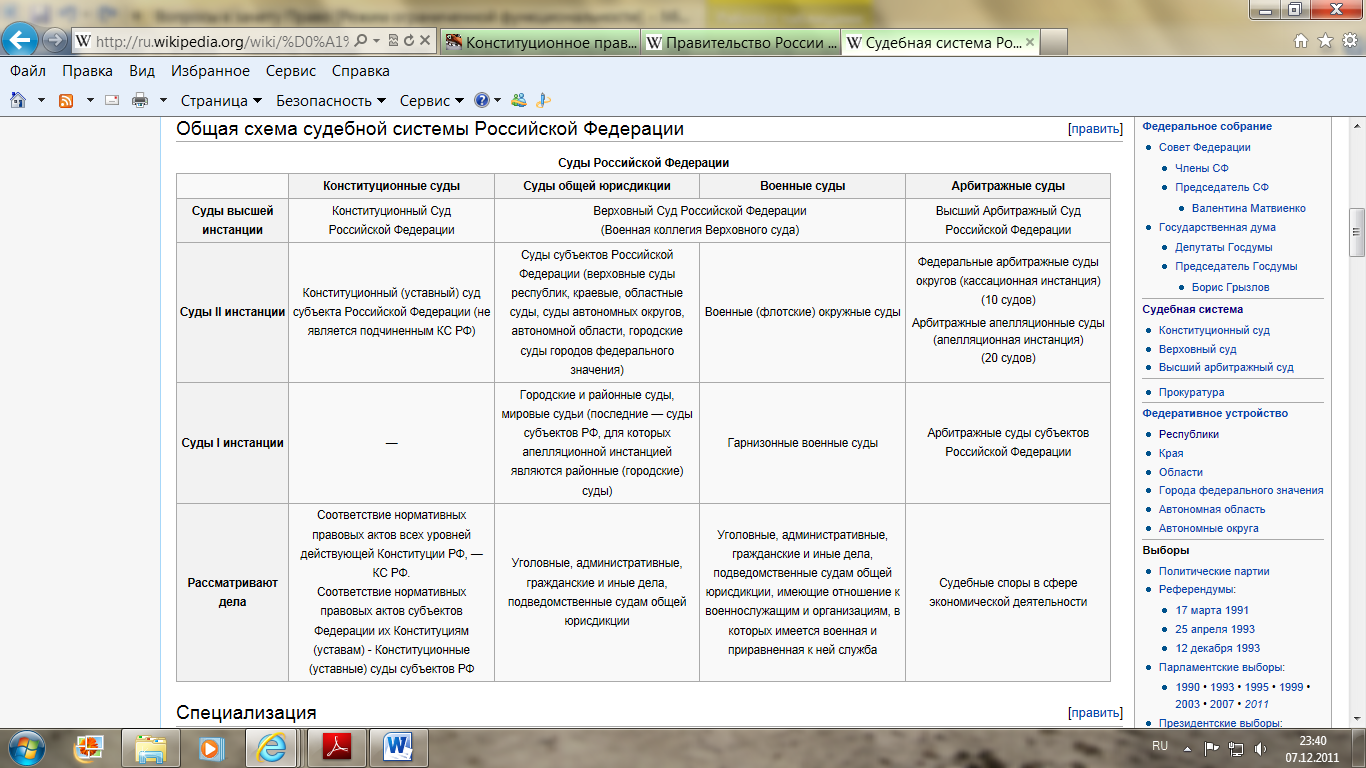 | 29. Ответ: Правоохранительные органы – это специальные органы, созданные государством в целях охраны права, действующие на основании и в соответствии с законом, наделенные правом применения мер принуждения, а в ряде случаев правом применения уголовного закона и обязанностью соблюдения определенной процессуальной формы. Систему правоохранительных органов можно подразделить на судебные органы (суды) и иные правоохранительные органы. 1.Судебная система, в свою очередь, включает в себя Конституционный Суд РФ, федеральные суды общей юрисдикции, систему арбитражных судов и суды (мировые судьи и конституционные (уставные) суды) субъектов РФ. 2. Иные правоохранительные органы также образуют систему, состоящую из: – органов прокуратуры; – органов внутренних дел; – федеральной службы безопасности; – органов государственной охраны; – органов государственной налоговой службы; – таможенных органов; – органов борьбы с незаконным оборотом наркотиков; – органов предварительного расследования; – органов юстиции. Система правоохранительных органов призвана реализовать такие важнейшие функции, как: – конституционный контроль; – отправление правосудия; – прокурорский надзор; – расследование преступлений; – оперативно-розыскная функция; – исполнение судебных решений; – оказание юридической помощи и защиты по уголовным делам; – предупреждение преступлений и иных правонарушений. Все эти функции взаимосвязаны и дополняют друг друга. Полномочия: |