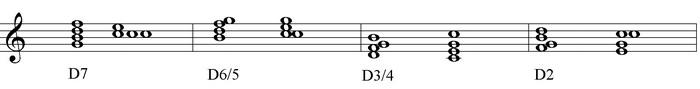 Доминантсептаккорд разрешается в неполное тоническое трезвучие с пропущенной квинтой и утроенным основным звуком Квинтсекстаккорд разрешается в полное тоническое трезвучие с удвоенной примой; Терцквартаккорд разрешается в полное чоническое трезвучие с удвоенным основным звуком в октаву; Секундаккорд разрешается в тонический секстаккорд с удвоенной примой. Доминантсептаккорд может вместо тонического трезвучия разрешиться в трезвучие шестой ступени с удвоенной серединой – прерванный оборот.