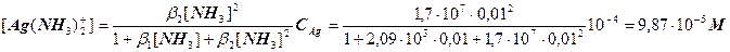 Як бачимо, левова частка Аргентуму (98,7%) перебуватиме у формі Ag(NH3)2+. Окрім зазначених іонів у розчині також будуть продукти дисоціації амоній нітрату – іони NH4+ та NO3-. Концентрація кожного з них 0,01 моль/л.