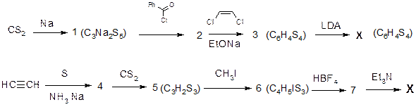 Задача 5 (20 балів) Речовина Х, яку використовують у конструюванні органічних провідників та надпровідників можe бути отримана за однією з наведених схем.