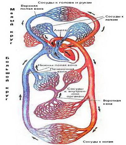 Сердечно-сосудистая система включает сердце и сосуды. По характеру циркулирующей в них жидкости различают два отдела: кровеносную и лимфатическую системы. Эти две системы тесно связаны между собой. Благодаря постоянному движению крови в сосудах, обеспечиваются основные функции системы кровообращения: транспорт веществ к клеткам и от них. К тканям доставляются питательные вещества, кислород, биологически активные вещества (гормоны, витамины, минеральные вещества), а из тканей удаляются углекислый газ и продукты обмена. Кровоток осуществляется по двум замкнутым кругам, соединенным между собой через сердце. Малый (легочной) круг кровообращения осуществляет контакт с внешней средой, а большой – с органами и тканями. Артериальное русло характеризуется высоким давлением крови и сравнительно небольшим объемом крови, а венозное – большим объемом крови и низким давлением. В артериальном русле содержится 15 – 20 % объема крови, в капиллярах – около 5 – 10 %, в венозном русле – 70 – 80 %. По уровню давления в сосудах выделяют область высокого давления (левый желудочек сердца, артерии крупного, среднего и мелкого калибра, артериолы) и область низкого давления (от капилляров до венул и от вен до левого предсердия). Общий объем крови у человека составляет 4 – 6 л, однако 45 – 50 % крови в покое не циркулирует по сосудам, а находится в так называемом «кровяных депо», участках венозного русла, способных к растяжению и расположенных в селезенке, печени, крупных венах брюшной полости и подкожных сосудистых сплетениях. Значение депо заключается в возможности быстрого увеличения массы циркулирующей крови, необходимой в данный момент для выполнения определенной функции.