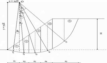 Рис.16. Розрахункова схема для визначення найнебезпечнішої поверхні ковзання зсуву за графіком Янбу та розрахунку стійкості відкосу. 5. Отримане тіло зсуву розбиваємо на блоки, причому одна з вертикальних меж проводиться через центр обертання, а ще одна - через бровку схилу. Інші вертикальні межі блоків проводяться через 3 - 5 метрів. 6. Нумеруємо блоки і визначаємо графічно, за масштабом рисунка параметри кожного блока, необхідні для виконання розрахунку стійкості: ширину блоку 7. Подальші розрахунки виконуємо в табличній формі: 8. Розраховуємо об’єм і вагу блоків за формулами: