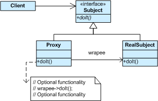 Заместитель Proxy и реальный объект RealSubject имеют одинаковые интерфейсы класса Subject, поэтому заместитель может использоваться "прозрачно" для клиента вместо реального объекта. UML-диаграмма классов паттерна Proxy