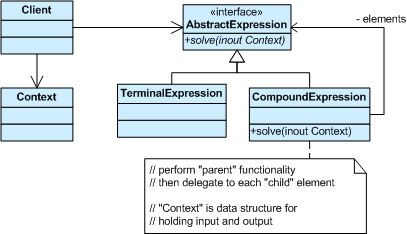 Рассмотрим задачу интерпретирования (вычисления) значений строковых представлений римских чисел. Используем следующую грамматику. romanNumeral::= {thousands} {hundreds} {tens} {ones} thousands,hundreds,tens,ones::= nine | four | {five} {one} {one} {one} nine::= "CM" | "XC" | "IX" four::= "CD" | "XL" | "IV" five::= 'D' | 'L' | 'V' one::= 'M' | 'C' | 'X' | 'I' Для проверки и интерпретации строки используется иерархия классов с общим базовым классом RNInterpreter, имеющим 4 под-интерпретатора. Каждый под-интерпретатор получает "контекст" (оставшуюся неразобранную часть строки и накопленное вычисленное значение разобранной части) и вносит свой вклад в процесс обработки. Под-переводчики просто определяют шаблонные методы, объявленные в базовом классе RNInterpreter. #include <iostream.h> #include <string.h> class Thousand; class Hundred; class Ten; class One; class RNInterpreter { public: RNInterpreter(); // ctor for client RNInterpreter(int){} // ctor for subclasses, avoids infinite loop int interpret(char*); // interpret() for client virtual void interpret(char *input, int &total) { // for internal use int index; index = 0; if (!strncmp(input, nine(), 2)) { total += 9 * multiplier(); index += 2; } else if (!strncmp(input, four(), 2)) { total += 4 * multiplier(); index += 2; } else { if (input[0] == five()) { total += 5 * multiplier(); index = 1; } else index = 0; for (int end = index + 3; index < end; index++) if (input[index] == one()) total += 1 * multiplier(); else break; } strcpy(input, &(input[index])); } // remove leading chars processed protected: // cannot be pure virtual because client asks for instance virtual char one(){} virtual char *four(){} virtual char five(){} virtual char *nine(){} virtual int multiplier(){} private: RNInterpreter *thousands; RNInterpreter *hundreds; RNInterpreter *tens; RNInterpreter *ones;}; class Thousand: public RNInterpreter{ public: // provide 1-arg ctor to avoid infinite loop in base class ctor Thousand(int): RNInterpreter(1){} protected: char one() { return 'M'; } char *four() { return ""; } char five() { return '\0'; } char *nine() { return ""; } int multiplier() { return 1000; }}; class Hundred: public RNInterpreter{ public: Hundred(int): RNInterpreter(1){} protected: char one() { return 'C'; } char *four() { return "CD"; } char five() { return 'D'; } char *nine() { return "CM"; } int multiplier() { return 100; }}; class Ten: public RNInterpreter{ public: Ten(int): RNInterpreter(1){} protected: char one() { return 'X'; } char *four() { return "XL"; } char five() { return 'L'; } char *nine() { return "XC"; } int multiplier() { return 10; }}; class One: public RNInterpreter{ public: One(int): RNInterpreter(1){} protected: char one() { return 'I'; } char *four() { return "IV"; } char five() { return 'V'; } char *nine() { return "IX"; } int multiplier() { return 1; }}; RNInterpreter::RNInterpreter(){ // use 1-arg ctor to avoid infinite loop thousands = new Thousand(1); hundreds = new Hundred(1); tens = new Ten(1); ones = new One(1);}