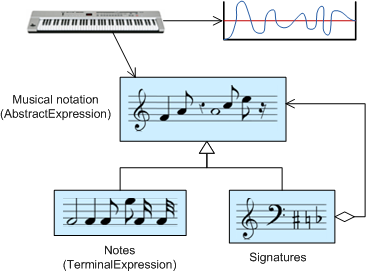 Паттерн Intepreter определяет грамматическое представление для языка и интерпретатор для интерпретации грамматики. Музыканты являются примерами интерпретаторов. Тональность и продолжительность звуков могут быть описаны нотами. Такое представление является музыкальным языком. Музыканты, используя ноты, способны воспроизвести оригинальные частоту и длительность каждого представленного звука.