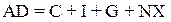 де C - споживчий попит – сукупний попит на товари та послуги. Він залежить від: – доходу від участі у виробництві; – податків і трансфертних платежів; – величини майна; – доходу від майна; – середньої та граничної схильності до споживання; – ступеня диференціації населення за доходами; – кількості населення. I ‑ інвестиційний попит– це попит на капітальне устаткування. Інвестиційний попит поділяється на три групи: 1. інвестиції в житлове будівництво; 2. виробничі інвестиції, тобто інвестиції в машини, устаткування; 3. інвестиції в товарно-матеріальні запаси. Інвестиційний попит залежить від: – обсягу виробництва; – витрат на капітал (податкова політика та відсоткова ставка) – кон’юнктурних коливань економіки. G ‑ державні закупки — це третій компонент попиту на товари та послуги. Держава закуповує зброю, послуги державних службовців, книжки для бібліотек, наймає вчителів, будує школи й дороги тощо. Усі ці та їм подібні операції складають компонент державних закупок товарів і послуг, на який припадає приблизно п’ята частина виробленого ВВП. Ці купівлі є одним із видів державних витрат. До іншого виду належать трансфертні платежі домогосподарствам, які не є частиною попиту на товари і послуги, їх збільшення за рахунок зростання податків не змінює використовуваний доход. Видатки держави на закупівлю товарів і послуг (G) визначаються державним бюджетом країни і є стабільною величиною. Таким чином, споживчі, інвестиційні та державні видатки становлять внутрішній попит. NX – зовнішній попит. Він залежить від співвідношення цін на вітчизняні й закордонні товари й обмінного курсу національних валют, тобто від реальних умов обміну. Оскільки сукупний попит має грошову форму, то зв’язок між рівнем цін і величиною сукупного попиту встановлюється основним рівнянням кількісної теорії грошей: