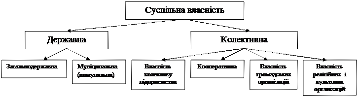 Державна власність поділяється на загальнодержавну і муніципальну (комунальну). Загальнодержавна власність — це спільна власність усіх громадян країни, яка не поділяється на частки і не персоніфікується між окремими учасниками економічного процесу. Власність необхідна державі для виконання економічних, соціальних і оборонних функцій. Об'єктами державної власності є природні ресурси (земля, її надра, ліси, води, повітряний простір), енергетика, транспорт, зв'язок, дороги, навчальні заклади, заклади національної культури, фундаментальна наука, оборонні та космічні об'єкти, рухоме й нерухоме майно, необхідне для функціонування адміністрації, армії, поліції. Муніципальна (комунальна) власність — це власність, яка перебуває в розпорядженні регіональних державних органів (області, міста, району тощо). Кооперативна власність — це об'єднана власність членів окремого кооперативу, створена на добровільних засадах для здійснення спільної діяльності. Власність кооперативу формується в результаті об'єднання майна, грошових внесків його членів і доходів, одержаних від їхньої спільної трудової діяльності. Кожен член кооперативу має однакові права на управління та дохід, який розподіляється відповідно до внесеного паю і трудового вкладу членів кооперативу. Власність трудового колективу — спільна власність, передана державою чи іншим суб'єктом у розпорядження колективу підприємства (на умовах викупу чи оренди), яка використовується відповідно до чинного законодавства. Колективна власність може існувати в різних видах залежно від джерела викупу. Якщо підприємство викуплене за рахунок накопиченого прибутку, то створюється неподільна власність колективу підприємства. Якщо підприємство було викуплено за рахунок особистих доходів його працівників, то утворюється пайова власність. Власність громадських та релігійних об'єднань створюється за рахунок власних коштів, пожертвувань громадян чи організацій або шляхом передачі державного майна. Суб'єктами такої власності є партії, профспілки, спортивні товариства, церкви та інші громадські організації. Змішана власність поєднує різні форми власності — приватну, державну, колективну, кооперативну та інші, в тому числі й власність іноземних суб'єктів.