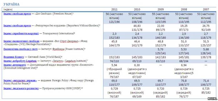 1. Щорічне дослідження свободи засобів інформації: 0 — максимум свободи, 100 — мінімум свободи; 0—30 — вільні, 31—60 — частково вільні, 61—100 — не вільні; http://freedomhouse.org/ 2. Відома також за французькою назвою Reporters sans Frontires (RSF); 0 — найкращий показник, підвищення означає погіршення; http://en.rsf.org/ 3. Індекс сприйняття корупції оцінює саме рівень сприйняття, а не рівень самої коупції; 0 — рівень сприйняття найбільшої корупції, 10 — рівень сприйняття найнижчої; TI наголошує, що її дані за різні роки не можна порівнювати; http://www.transparency.org/ 4.0 — найменший рівень економічної свободи, 100 — найбільший; http://www.heritage.org/index/