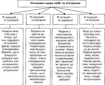 Рис. 2.3. Види установок (за К. Меллером і П. Хегедалем) Підхід людини до визначення ситуації залежить від бачення нею картини світу. На думку Т. Шибутані, картина світу - це Психологічний захист та його механізми впорядкований погляд на навколишній світ, на те, що сприймається як саме собою зрозуміле у фізичних об'єктах, подіях та людській природі. Картина світу людини - це контурна схема, яка випереджає досвід, визначає його і керує ним [53, с. 104]. Оскільки кожен опановує єдиний у своєму роді досвід, він напрацьовує особливі засоби дії з багатьма конфіденційно визначеними об'єктами і таким чином формує свої власні значення. Такі значення є особистими не тому, що недоступні іншим, а тому, що організація тенденцій поведінки є ідіосинкретичною [53, с. 102]. Критичні ситуації вимагають від людини конкретної внутрішньої праці. Різного роду стресові реакції часто виявляються у вигляді граничної активації внутрішніх ресурсів особистості, яка відстоює свої колишні можливості реалізації життєвих задумів. Більш складні ситуації можуть вимагати від людини перегляду рівня своїх життєвих домагань та одночасної реконструкції свого "Я". Якщо людина не здатна ефективно контролювати деякі життєві ситуації, на допомогу їй приходять механізми психологічного захисту, які забезпечують їй підсвідому компенсацію цієї нездатності і послаблюють пов'язані з нею стрес і тривогу. Психологічний захист - це нормальний механізм, спрямований на попередження розладів поведінки не тільки в межах конфліктів між свідомістю та несвідомим, але й між різними емоційно забарвленими установками. За визначенням Р.С. Немова, захисні механізми - це психоаналітичне поняття, яке позначає сукупність несвідомих прийомів, за допомогою яких людина як особистість оберігає себе від психологічних травм. Механізми психологічного захисту, досліджені 3. Фрейдом та його дочкою Анною, дуже різноманітні. Основними механізмами психологічного захисту є: > заперечення (інформація, що тривожить та може призвести до конфлікту, не сприймається людиною); > витіснення (активне вилучення зі свідомості неприємного мотиву або неприємної інформації); > проекція (неусвідомлене приписування іншій особі власних почуттів, бажань та потягів, які людина не хоче визнавати своїми, розуміючи їх соціальну неприпустимість); > ідентифікація (несвідоме перенесення на себе почуттів та якостей, притаманних іншій людині - недоступних, але бажаних для себе); > раціоналізація (псевдорозумне пояснення людиною своїх бажань, вчинків, насправді викликаних причинами, визнання яких загрожувало б втратою самоповаги); > заміщення (перенесення дії, спрямованої на недоступний об'єкт, на дію з доступним об'єктом. Зменшує напруження, створене недоступним об'єктом потреби, але не призводить до бажаної мети). Психологічний захист виявляється у тенденції людини зберігати звичну думку про себе та світ, зменшувати дисонанс, відки-даючи або викривлюючи інформацію, що розцінюється як несприятлива, або те, що руйнує попереднє уявлення про себе та інших. Досвід, несумісний з уявленнями людини про себе, має тенденцію не допускатися до усвідомлення. Це досягається або викривленням сприйняття, або запереченням сприйнятого, або його забуванням. Механізми психологічного захисту служать засобом боротьби з тривогою, доки людина не знайд