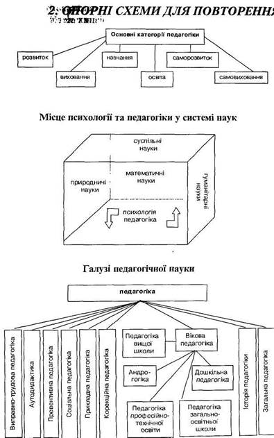3. ВИСНОВКИ Сучасна педагогіка досліджує сутність розвитку та формування особистості, на цій основі визначає теорію та методику навчання, виховання, тому педагогічні знання необхідні не тільки педагогам, але й усім, хто працює з людьми. Педагогіка - це наука, яка має свій предмет, різноманітну інформацію про цей предмет, свідченням чого є система педагогічних наук, понятійний апарат. Педагогіка - це й мистецтво. Мистецтво у педагогіці - це реалізація теорії на високому рівні майстерності. Педагогіка як наука існує з XVII ст. Первинною в історії розвитку педагогіки була практика. Чим багатшим та складнішим ставав накопичений досвід, тим більша майстерність вимагалася для його передачі, а, отже, і теоретичного осмислення. Чим вищим ставав рівень розвитку суспільства, тим більше творчості та досконалості вимагала система освіти. Сучасна педагогіка - багатогалузева наука.. її галузями є: загальна педагогіка, історія педагогіки, вікова, корекційна, прикладна педагогіка. Педагогіка взаємодіє з багатьма науками: філософією, соціологією, психологією, генетикою, кібернетикою і фізіологією, тісно пов'язана з проблемою врахування індивідуально-психологічних, фізіологічних особливостей учнів. На межі XX і XXI століть створюється національна система освіти незалежної Української держави. Розвиток людини - це процес становлення і формування її особистості під впливом зовнішніх і внутрішніх, керованих і не-керованих чинників. Він являє собою процес фізичного, розумового і морального зростання людини й охоплює всі кількісні й якісні зміни вроджених і набутих якостей. Особистісний розвиток людини несе на собі ознаку її вікових і індивідуальних особливостей, які необхідно враховувати в процесі виховання. Формуючи особистість, необхідно враховувати загальні педагогічні закономірності і принципи формування особистості. Загальні закономірності та принципи відносять до всієї системи формування особистості, яка організується на кількох рівнях: індивідуальному, груповому, державному. Навчання - це один з провідних механізмів, який забезпечує розвиток особистості, тому що він веде до оволодіння знаннями, уміннями, професією. Це один з оптимальних способів соціальної адаптації. Галузь педагогіки, яка розробляє теоретичні та методичні основи навчання, називається дидактикою. Процес навчання складався протягом тривалого часу, його структура нині включає закономірності, принципи, мету, зміст, форми, методи, засоби. Важливою складовою процесу навчання є контроль та оцінка його результатів. Методи навчання - це способи спільної діяльності вчителя та учнів, спрямовані на досягнення мети навчання. Серед великої кількості видів організації процесу навчання кожен з них вирішує певні дидактичні задачі і виконує своє призначення. Особливе місце у сучасній дидактиці належить активному навчанню. Ефективність процесу навчання залежить від багатьох чинників, але найважливішим залишається особистість педагога, його професіоналізм. У наш час психологія та педагогіка користуються цілим арсеналом наукових методів збору інформації, до якого входять спостереження, експеримент (природний та лабораторний), бесіда, інтерв'ю, різноманітні тести, контент-аналізи та ін. Наукові психолого-педагогічні дослідження проводяться в декілька етапів, кожний з яки