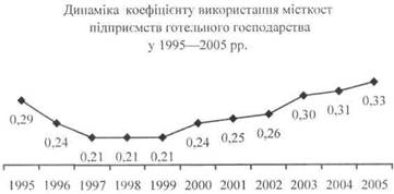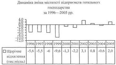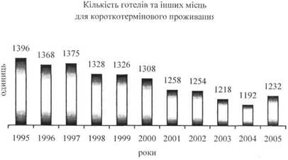 Починаючи з 1995 p., зберігалася тенденція скорочення кількості підприємств готельного господарства через збитковість, надання в оренду іншим підприємствам тощо. У 2005 р. ситуація дещо змінилася на краще, намітилась тенденція на збільшення підприємств готельного господарства. Так, на території України в 2005 р. функціонувало вже 1232 підприємства готельного господарства, у т. ч. 788 готелів, 17 мотелів, 8 готельно-офісних центрів, 6 кемпінгів, 35 молодіжних баз та гірських притулків, 235 гуртожитків для приїжджих та 143 інших місця для короткотермінового проживання. Порівняно з 2004 р. їхня кількість збільшилася на 40 одиниць, або на 3,4 %. Це відбулося в основному внаслідок створення нових готелів, розширення кола звітуючих непрофільних підприємств, які мають на своєму балансі молодіжні турбази і гірські притулки та інші місця для короткотермінового розміщення, або тих підприємств, що в звітному році розпочали діяльність з наданням готельних послуг.