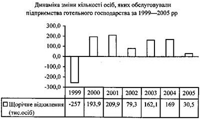 Починаючи з 2000 р., в Україні намітилася позитивна тенденція зростання кількості осіб, яких обслугували підприємства готельного господарства. Тільки упродовж 2005 р. в готелях та інших місцях для короткотермінового проживання було обслуговано 3938,2 тис. приїжджих, що на 30,5 тис, або 0,8 %, більше, ніж у 2004 p.; 199,5 тис, або на 5,3 % більше, ніж у 2003 p.; 361,3 тис, або на 10,1 % більше, ніж у 2002 p.; 440,9 тис, або на 12,6% більше, ніж у 2001 p.; 650,8 тис, або на 19,6 % більше, ніж у 2000 p.; 844,7 тис, або на 27,3 % більше, ніж у 1999 p.; 587,7 тис, або на 17,5 % більше, ніж у 1998 р.