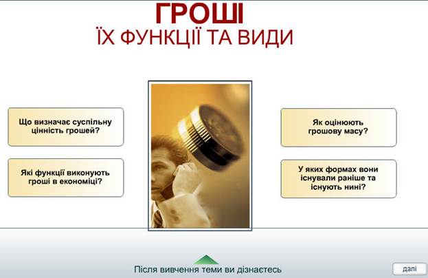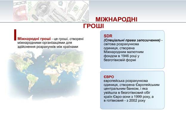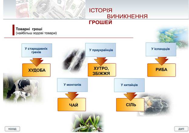 ІІІ. Домашнє завдання: 1. Перелічити назви валюти держав, які межують з Україною. 2. Підготувати доповідь про один із засобів, що замінюють гроші (чеки, векселі, кредитні картки). Отже, перший період розвитку української культури охоплює часовий відрізок від її витоків і до прийняття християнства, тобто — це культура східнослов'янських племен дохристиянської доби. Перше тисячоліття нової ери для розвитку української культури було сповнене рядом подій історичної ваги: виникнення Києва — "матері міст руських"; об'єднання східнослов'янських племен і утворення держави — Київської Русі; переможні походи руських князів та розширення державних кордонів; небувале піднесення культури від безпосереднього спілкування з хозарами, половцями, Візантією та іншими народами; і, нарешті, запровадження християнства. Все це разом поставило український народ та його культуру в один ряд з іншими високорозвинутими народами та культурами Європи і світу. Другий період розвитку української культури припадає на час існування княжої держави — Київської Русі та Галицько-Волинського князівства. Так його й іменуємо: українська культура княжої доби. Держава Київська Русь — могутня ранньофеодальна військово-деспотична імперія, що вона від часу свого виникнення перебрала на себе роль покровителя, мецената і доброчинця культури, стала провідною матеріальною основою її розвою. Культуротворчий процес у цілому гальмувався і деформувався. Відродження національної державності (наприклад, доба Галицько-Волинського князівства) як правило, активізувало творчі сили народу, культура, наче птах-фенікс, відроджувалася з попелу, ставала більш всеохопною й оригінальною. Так, через підйоми і спади й відбувався процес розвитку нашої культури княжої доби. Третій період розвитку української культури припадає на литовсько-польську добу в історії нашого народу. Після втрати власної державності умови для розвитку української культури були неоднаковими в різних регіонах України. Починаючи буквально від кінця монголо-татарської навали і аж до 1569 року (рік Люблінської унії), українські землі поступово, від небагатьох до більшості, переходили під владу Великого князівства Литовського, яке перейняло у нас багато рис адміністративного устрою, основи юридичного права і традицію літописання, що брали свій початок ще з доби Київської держави. У Галичині панівні позиції відразу після її загарбання Польщею перейшли до польських феодалів, а в усіх великих містах — до католицьких колоністів-міщан. Таким чином відбувалася ліквідація тих політичних центрів, навколо яких кристалізувалося і вирувало культурне життя. Розвиток української культури в польсько-литовську добу позначений тісною взаємозалежністю та взаємопереплетінням національно-визвольної боротьби і руху за відродження української культури. У ході цього руху не лише формувалися ідеологічні передумови всенародної визвольної війни, що розпочалась в Україні 1648 року, а й створювались культурні цінності, які стали основою розвитку української культури протягом наступних століть. Четвертий період розвитку української культури припадає на козацько-гетьманську добу. Визначальним тут виступає фактор національної державності, яка, проіснувавши понад 130 років, все ж таки змогла істотно сформувати спрямованіст