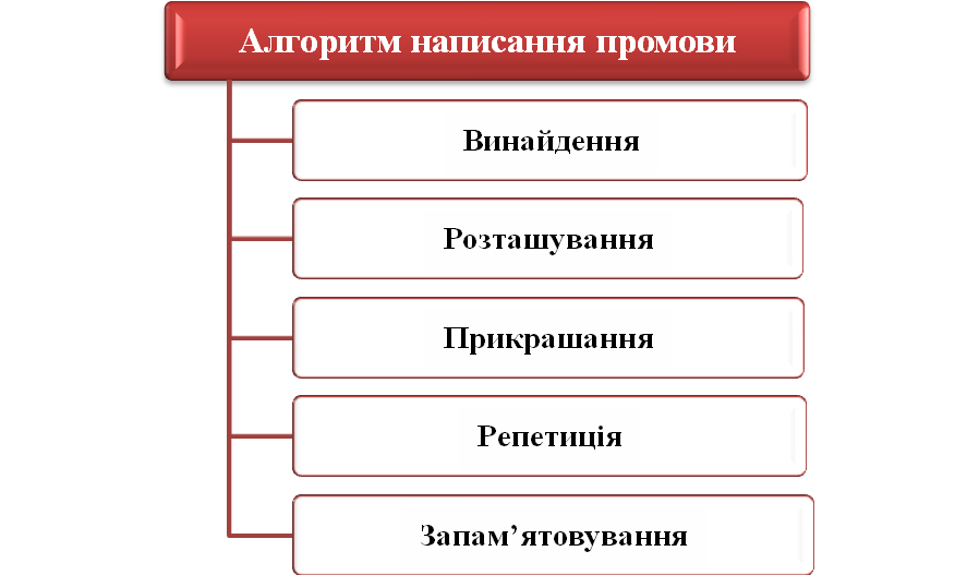 Рис. 5.9 – Алгоритм написання промови 1. Винайдення (inventio – “винайти, що сказати”) – процедура “попередньої рефлексії”, тобто визначення теми і мети майбутнього виступу, розробки концепції, відбору матеріалу для промови. Інвенція відповідає вимозі змістовності ораторської промови. 2. Розташування (dispositio – “розташувати винайдене”) – етап ранжування компонентів матеріалу, здобутого в процесі інвенції, етап побудови композиції промови. Диспозиція відповідає вимозі логічності, ясності та цільності ораторської промови. 3. Прикрашання (elocutio – “прикрасити словом”) – процес словесної реалізації концепції, словесна “орнаментація” тексту. Риторика пропонує цілу скарбницю мовних засобів виразності: тропів і фігур, що дозволяють створити текст, відповідний вимогам ясності, точності, стислості, виразності мовлення. 4. Репетиція (aktio – “дія”, “рух”). Акція як розділ риторики дає рекомендації щодо інтонаційної виразності мовлення, зовнішнього вигляду оратора, поведінки перед аудиторією. 5. Запам’ятовування (memoria – “пам’ять”) – мнемотехніка – прийоми запам’ятовування матеріалу [21]. Основні поняття і ключові слова: публічний виступ, промова, алгоритм написання промови.