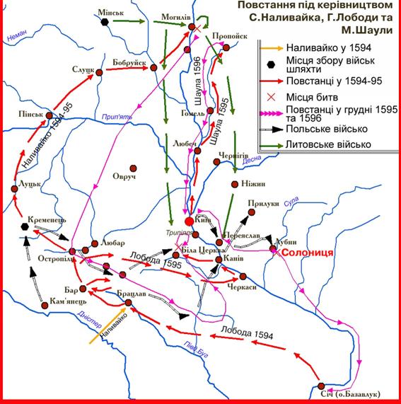У лютому 1596 р. на придушення повстання вирушило велике польсько-литовське військо, очолюване коронним польним гетьманомСтаніславом Жолкевським. 22—24 травня 1586 р. йому вдалося взяти в облогу козацький табір в урочищі Солониця біля Лубен. Підступом заволодівши табором, воїни Жолкевського вирізали кілька тисяч повстанців, їхніх жінок і дітей. Наливайка було узято в полон, відправлено до Варшави й після страшних тортур страчено.