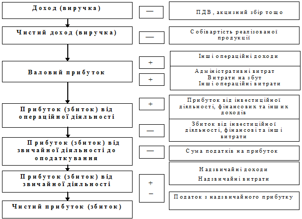 Рис. 8.1. Послідовність визначення чистого прибутку або збитку звітного періоду від реалізації продукції (товарів, робіт, послуг)
