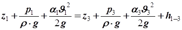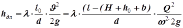 где: · р1 и р3 – абсолютные давления в центрах тяжести сечений; · J1 и J3 – средние скорости в сечениях; · z1 и z3 – высоты центров тяжести сечений относительно плоскости отсчета 0-0; · h1-3 –потери напора при движении жидкости от первого до второго сечения. 2. Определяем слагаемые уравнения Бернулли в данной задаче. · Высоты центров тяжести сечений: z1 = 0; z2 = h0; · Средние скорости в сечениях: J3 = Q/w=4×Q/p/d2; J1 = Q/w1. Так как w1>>/w3, то J1 <<J3 и можно принять J1 =0. · Коэффициенты Кориолиса a1 и a2 зависят от режима движения жидкости. При ламинарном режиме a =2, а при турбулентном a =1. · Абсолютное давление в первом сечении р1 = рат, · Абсолютное давление в сечении 3-3 неизвестно и подлежит определению.. · Потери напора h1-3 складываются из потерь напора на трение по длине потока hдл и потерь на местные гидравлические сопротивления å hм: h1-3 = hдл + å hм. · Потери по длине равны: