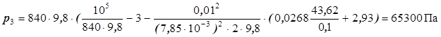 Из уравнения (48) определяем давление р3. Значение коэффициента трения определено ранее и равно 0,0268 (см. таблицы), a = 1 (режим турбулентный), w=p×d2 /4 = 3,14×0,12/4=7,85×10-3м2.
