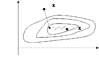 Таким чином, спуск виробляється лише по тими змінним, у напрямку яких похідна цільової функції досить велика. Це дозволяє швидко спуститися на «дно яру». Ми спускаємося доти, поки метод не зациклиться, тобто доти, поки кожна наступна ітерація дозволяє знайти точку, у якій значення функції менше, ніж значення, знайдене в попередній ітерації. Після цього переходимо до наступного етапу. На другому етапі задається деяке велике число d2>>1 і використовується процедура спуску, де замість градієнта