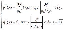 У цьому випадку переміщення відбувається по «березі» яру уздовж його «дна». Як і на першому етапі, спуск триває доти, поки метод не зациклиться. Після виконання першого й другого етапів приймається рішення про завершення роботи або продовження. Для цього рівняється норма різниці попередньої точки, тобто точки, що ми мали до застосування першого й другого етапів, з поточною точкою, тобто отриманої після застосування з точністю рішення задачі e 1. Якщо ця норма менше e 1 і норма градієнта в поточній точці менше e 3, то пошук закінчується й остання обчислена точка приймається за наближений розв’язок задачі. Інакше для поточної точки знову повторюємо перший і другий етапи й т.д.