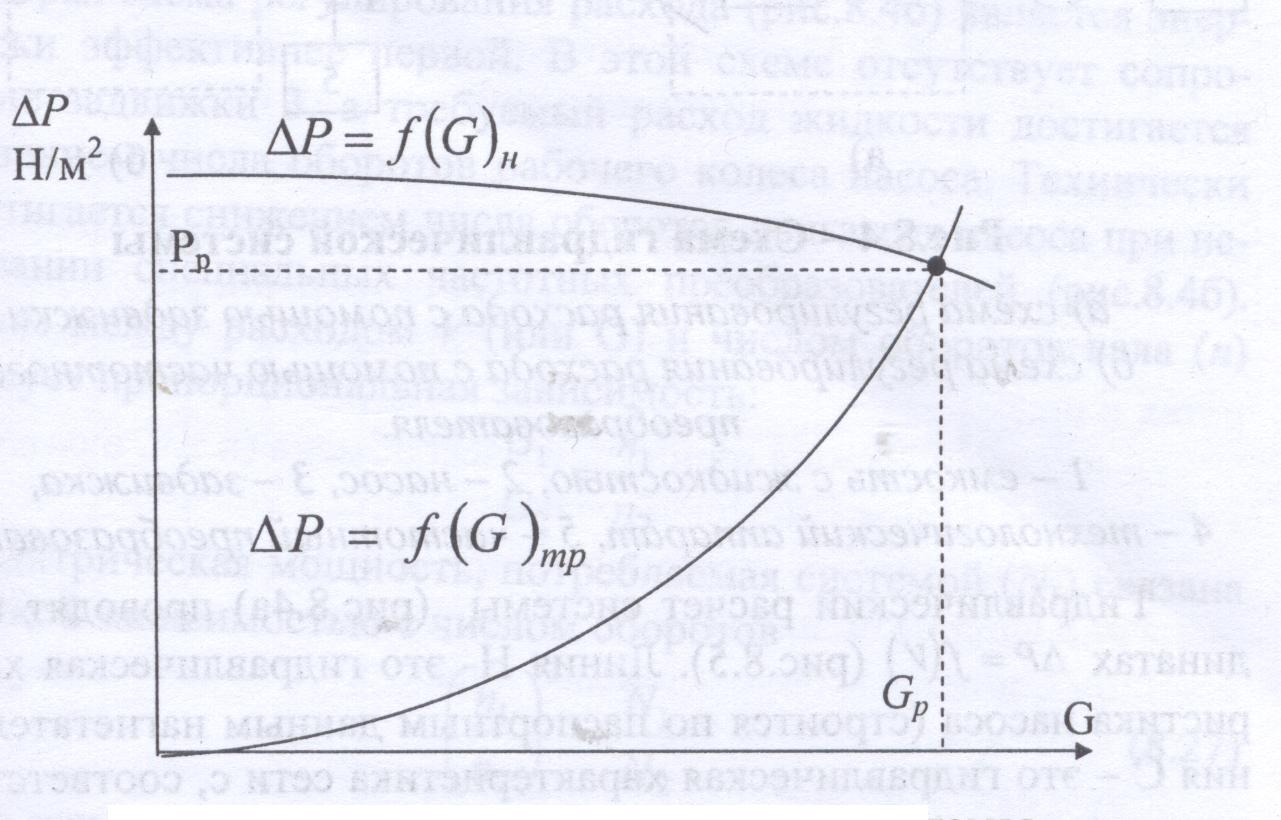 Ниже представлены типичные графики зависимостей напора и потерь давления от расхода для сети и центробежного насоса и условия их согласования.