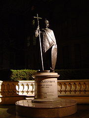 Святий Володимир, який приєднав землі Галичини і Волині до Руської держави (пам'ятник у Лондоні). У 6 — 7 століттях на землях сучасних Галичини і Волині існували потужні родоплемінні союзи. На початку 7 століття згадуються дуліби, наприкінці століття — бужани, черв'яни, уличі, білі хорвати, землі яких включали по 200 — 300 поселень. Раніше середини 9 століття існувало об'єднанняволинян, якому підлягали інші племена (мало великий авторитет серед слов'ян). Центрами таких племінних політичних об'єднань були укріплені«гради». Відомо, що білі хорвати і дуліби виступали «толковинами», тобто союзниками русинів у поході Олега на Візантію 907 року. Історики припускають, що на початку 960-х років землі Галичини і Волині були приєднані до Київської держави Святославом І Завойовником; після його смерті у 972 році були захоплені сусідньою Польщею.[6] У 981 році його син Володимир І Святий повернув собі Галичину і Волинь, включно зПеремишлем і Червеном; 992 року підкорив білих хорватів, остаточно приєднав Підкарпаття. 1018 року польський король Болеслав Хоробрийскористався міжусобицями руських князів, захопив Червенські міста (перебували під чужоземною окупацією 12 років; Ярослав Мудрий повернув у походах 1030–1031 років). У наступні роки з Польщею був укладений мир, який залишав за Руссю Червен і Перемишль. Князівства Галичини і Волині[ред. • ред. код] На середину 11 століття землі Галичини і Волині остаточно закріпилися у складі Руської держави. Серед них провідне місце посідала Волинь — багатолюдна земля з розвинутими містами, торговим шляхом на захід. Столицею усіх західноруських земель було місто Володимир, де знаходився княжий престол і єпископія. Київські монархи довгий час утримували ці стратегічно важливі території, уберігаючи їх від дроблення на удільні князівства.[7] У 1084 роках у землях Галичини вокняжилися Ростиславичі, князі ізгої Рюрик, Володар і Василько. У результаті воєн з волинськими і київськими князями наприкінці 11 століття вони вибороли собі незалежні князівства. У 1141 році ці князівства були об'єднані сином Володара Володимирком в єдине удільне Галицьке князівство зі столицею в Галичі. Воно підтримувало зв'язок із київськими і суздальськими князями; половцями для протистояння зазіханням волинських, польських, угорських правителів. За правління сина Володимирка Ярослава Осмомисла Галицьке князівство поставило під свій контроль землі сучасної Молдови, Придунав'я. Після смерті Ярослава у 1187 році бояри не захотіли приймати його синів князями; «скоївся великий заколот в Галицькій земли», у результаті якого вона була окупована угорськими військами короля Бели ІІІ. За допомоги німецького імператора Фрідріха Барбаросси, Польщі Галич був повернутий останньому князю з гілки Ростиславичів,Володимиру Ярославичу.[8] На противагу швидкому виокремленню Галичини в удільне князівство, стратегічно важлива для Києва Волинь перебувала в залежності від нього до 1160-тих років. Її виділення в окреме князівство розпочав київський князь Ізяслав Мстиславич, внук Володимира Мономаха, який почувався непевно на київському престолі. Його син Мстислав Ізяславич зумів забезпечити Волинь своїй родині, і з того часу Волинська земля розвивалась як незалежне князівство.[9] Заснування єдиного князівства[ред. • ред. код]