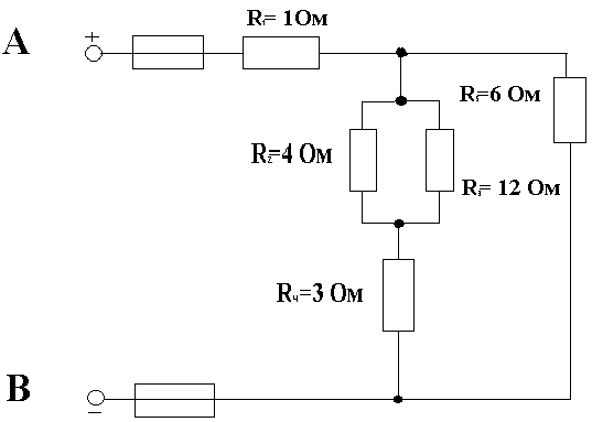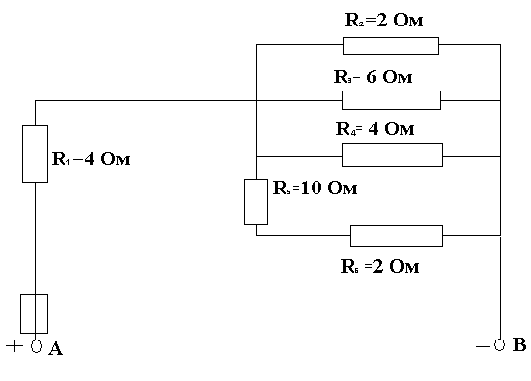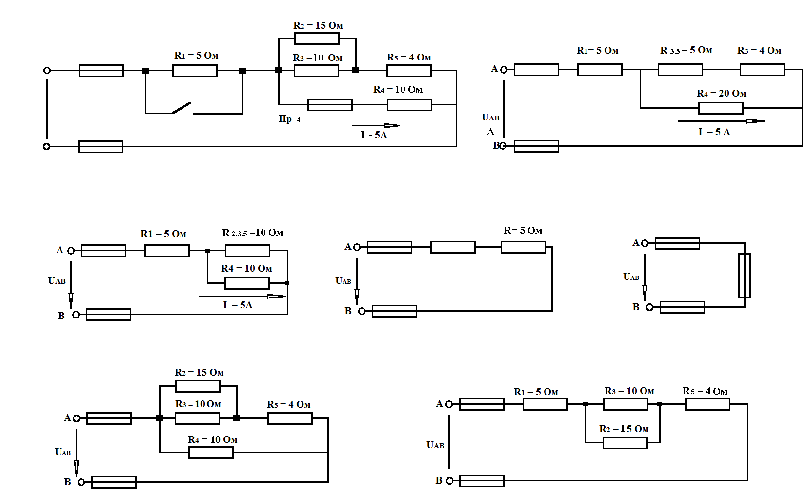 Рисунок 1 Для схемы, приведенной на рис.1, определить эквивалентное сопротивление цепи RАВ, токи в каждом резисторе и напряжение UАВ, приближенное к цепи. Заданы сопротивления резисторов и ток I4 и R2. Как изменятся токи в резисторах при а) замыкании рубильника Р1; б) расплавлении вставки предохранителя Пр.4 В обоих случаях напряжение UАВ остается неизменным.