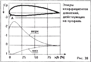 Сp - Коэффициент давления. Примечание: Твердое тело, взаимодействуя с потоком воздуха, изменяет его характеристики (давление, плотность, скорость). Под характеристиками невозмущенного потока мы будем понимать характеристики потока на бесконечно большом удалении от исследуемого тела. То есть там где исследуемое тело с потоком не взаимодействует (не возмущает его). Коэффициент Ср показывает относительную разницу между давлением воздушного потока на крыло (параплан) и атмосферным давлением в невозмущенном потоке. Там где Ср<0 поток разряжен. Там где Ср>0 поток испытывает сжатие. Особо отметим точку 'А'. Это критическая точка. В ней происходит разделение потока. В этом месте скорость потока равна нулю, давление максимально и равно давлению торможения, а коэффициент давления Ср=1.
