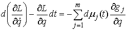 В этом разделе мы выведем уравнения движения механических систем с односторонними связями в форме уравнений Лагранжа второго рода. Такие уравнения можно получить, обычным образом, если удерживающие и односторонние связи голономны. Пусть Мы считаем, что функции отсюда Кроме того или, в матричной форме Подставив (10.2) в уравнения удерживающих связей (7.3) получим систему Воспользуемся матричной формой уравнений Лагранжа 1-го рода (8.11). Где Матрица Использовав (10.3, 10.4), получаем отсюда Введем кинетическую энергию системы Как обычно, обозначим вектор обобщенных сил Обозначим Подставив (10.8-10.11) в (10.6) получим или, в покоординатном виде Теорема Аппеля. Пусть в момент Где Потенциальный случай. Если силы потенциальны и имеют силовую функцию Здесь везде