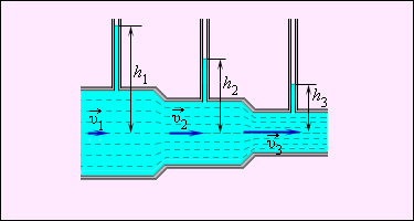 Величина p – статическое давление в жидкости. Оно может быть измерено с помощью манометра, перемещающегося вместе с жидкостью. Практически давление в разных сечениях трубы измеряется с помощью манометрических трубок, вставленных через боковые стенки в поток жидкости, так чтобы нижние концы трубок были параллельны скоростям частиц жидкости (рис. 1.22.2). Из уравнения Бернулли следует: Давление в жидкости, текущей по горизонтальной трубе переменного сечения, больше в тех сечениях потока, в которых скорость ее движения меньше, и наоборот, давление меньше в тех сечениях, в которых скорость больше.