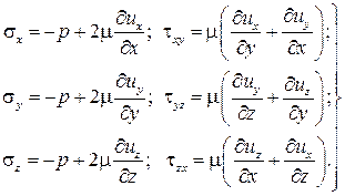 т.е. среднеарифметическое значение сжимающих нормальных основных компонентов напряжений. Если ньютоновская жидкость находится в покое, то в ее соответствии с уравнением (1.2) в ней не могут возникнуть касательные напряжения, т. е Это означает, что в покоящейся жидкости напряжения не зависят от ориентации площадки, а давление в ней p = - pn=- s x=- s y=- s z. Закон внутреннего трения в обобщенной форме. Это эмпирический закон, устанавливающий связь компонентов тензора скоростей деформаций (2.20) и тензора напряжений (3.1). Представим выражение (3.1) в виде где