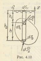 Если пронизать тело, погруженное в жидкость, вертикальным цилиндром с основанием dsг, то на площадки ds1 и ds2, отсекаемые на поверхности тела (рис. 4.10), действуют соответственно гидростатические силы, вертикальные составляющие которых dP1z=rgh1sr и dP2z=rgh2sr. Результирующая сила направлена вверх и равна dPz =dP2z—dPlz= где dW — объем тела, отсекаемый элементарным цилиндром. Просуммировав силы по всей поверхности тела, найдем, что Pz=rgW, где W — объем тела, погруженного в жидкость. Поскольку идеальная жидкость имеет v =m=0, то уравнения (3.10) и (3.10') примут соответственно вид
