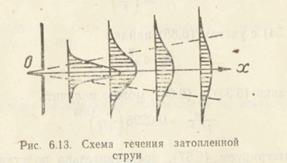 Где Из анализа (6.70) видно, что с удалением от отверстия скорость в струе уменьшается. При этом, однако, количество увлекаемой в движение жидкости увеличивается, струя расширяется и расход жидкости