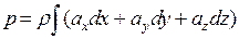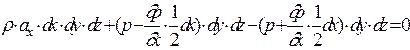 Уравнение Эйлера для равновесия жидкости - совокупное дифференциальное уравнение равновесия жидкости под действием произвольных внешних сил. Если dP1 и dP2 - внешние силы, то условие равновесия: dP1 - dP2 + dFx = 0; где dFx = dM × ax, dM = r × dW, dW = dx × dy × dz. Сила гидростатического давления: dP = p × dw, если р1 и р2 - давление в точках приложения сил dР1 и dР2, то dР1 = p1 × dy × dz и dР2 = p2 × dy × dz. Если р = давление в центре тяжести, то: Уравнение равновесия: