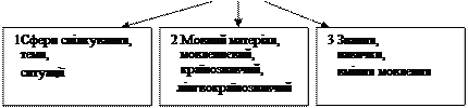 в) Формування комунікативної компетенції можливе за умови моделювання у навчальному процесі типових ситуацій реального спілкування, які виникають в різних сферах життя і стосуються різних тем. Тобто предметно-змістовий план іншомовного мовлення учнів під час навчання зумовлюється темою, ситуацією і сферою спілкування, які виступають ще одним компонентом змісту навчання.