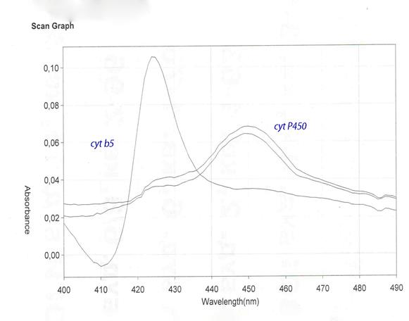 Рис. Спектр поглинання відновленого цитохрому b5 та відновленого цитохрому Р-450 у присутності СО