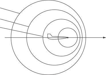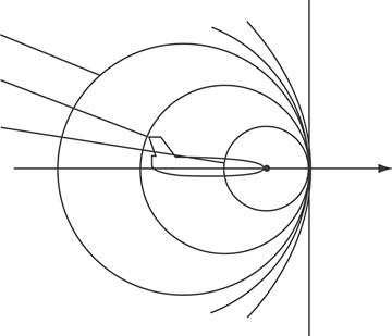 Рис. 10. Распространение возмущений в сжимаемой среде от точечного источника, движущегося с дозвуковой скоростью относительно среды