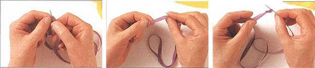 Протягніть стрічку в голку і прошийте нею тканину таким чином, щоб вузол залишився з виворітного боку. При необхідності обріжте зайву стрічку.