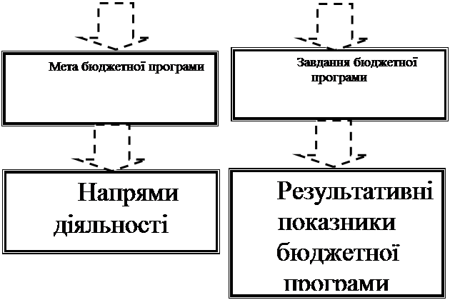 Основним елементом програмно-цільового методу є бюджетна програма. Б юджетна програма – сукупність заходів, спрямованих на досягнення єдиної мети, завдань та очікуваного результату, визначення та реалізацію яких здійснює розпорядник бюджетних коштів відповідно до покладених на нього функцій. Суть бюджетної програми розкривається через її характеристики, які відображені в бюджетній документації, зокрема бюджетному запиті, паспорті бюджетної програми, звіті про виконання паспорта бюджетної програми. Методологічні визначення характеристик бюджетних програм унормовані Концепцією застосування програмно-цільового методу в бюджетному процесі, схваленою розпорядженням Кабінету Міністрів України від 14.09.2002 № 538-р та наказом Міністерства фінансів України «Про паспорти бюджетних програм» від 29.12.2002 № 1098. Код бюджетної програми складається із семи цифрових знаків, з яких: перший, другий і третій визначають головного розпорядника бюджетних коштів (відповідний код відомчої класифікації видатків бюджету); четвертий - відповідальних виконавців бюджетних програм головного розпорядника бюджетних коштів (якщо відповідальним виконавцем є структурний підрозділ центрального апарату головного розпорядника бюджетних коштів ставиться цифра "1", щодо всіх інших відповідальних виконавців використовуються цифри від "2" до "9"); п'ятий і шостий - бюджетну програму, виконання якої забезпечує один відповідальний виконавець. Якщо програма пов'язана з утриманням апарату органів державної влади, ставляться цифри "01", для всіх інших бюджетних програм - від "02" і далі залежно від номера бюджетної програми одного відповідального виконавця; сьомий - напрям діяльності в конкретній бюджетній програмі (цифри від "1" до "9"). Складовими елементами бюджетної програми є: 1) мета бюджетної програми - законодавчо визначені основні цілі, яких необхідно досягти у результаті виконання конкретної бюджетної програми; 2) завдання бюджетної програми - конкретні цілі, яких необхідно досягти у результаті виконання бюджетної програми протягом відповідного бюджетного періоду і оцінити які можна за допомогою результативних показників; 3) напрями діяльності - конкретні дії, спрямовані на виконання завдань бюджетної програми, з визначенням напрямів витрачання бюджетних коштів. Напрями діяльності повинні відповідати завданням і функціям головного розпорядника бюджетних коштів. Визначення напрямів діяльності забезпечує реалізацію бюджетної програми у межах коштів, виділених на цю мету; 4) результативні показники - кількісні та якісні показники, які характеризують результати виконання бюджетної програми і підтверджуються статистичною, бухгалтерською та іншою звітністю і які дають можливість здійснити оцінку використання коштів на виконання бюджетної програми. альтернативних шляхів вирішення поставлених задач, проблем тощо.