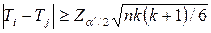 де п — кількість об’єктів у групі, k — кількість замірів, що відповідають різним значенням змушуючого фактора, Критерій має правосторонню критичну область. Для невеликих вибірок і невеликого k= 3 та k= 4 критичні значення статистики Фрідмана наведено в таблиці 12 додатка. Для великих вибірок статистика має розподіл, близький до Заміри i та j можна вважати попарно різними на спільному рівні значущості a, якщо