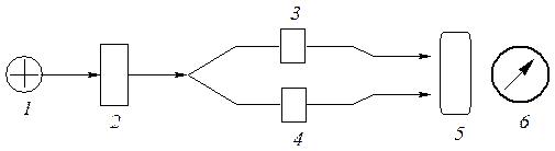 Рис. 9- Блок-схема атомно-абсорбційного спектрофотометра: 1 – джерело резонансного випромінювання; 2 – атомізатор; 3 – монохроматор; 4 – фотоелемент; 5 – підсилювач; 6 – гальванометр.