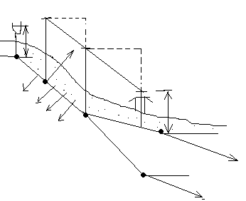 Цель расчета: подобрать диаметры труб по участку. Рассчитать потери напора, построить пьезометрическую линию и определить необходимую высоту водонапорной башни. Порядок расчета: 1. определяем расчетные расходы по участкам.начинаем сзади. Уч. К 3-4 Q4=g4 3-5 Q5=g5 2-3 Q2-3=g4+g5+0.57gнрl 2. выделяем расчетную магистраль и рассчитываем её как простой длинный трубопровод. Она выделяется по 3-м признакам. 1) По наибольшей длине 2) По наивысшим конечным отметкам заложения труб 3) По наибольшему требуемому свободному напору. 3. Выбор производится по преимуществу 3-х признаков. Пусть магистралью является линия 1-2-3-4 4. Расчет магистрали. принимаем скорость движения в трубах равной экономической скорости. Строим пьезометрическую лини. Отметка пьезометрической линии в точке 4 и равна