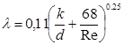 Здесь k -эквивалентная абсолютная шероховатость, т.е. такая равномерная зернистая шероховатость Никурадзе, которая при расчетах дает такой же коэффициент λ., как и естественная шероховатость. Отметим, что при малых Rе (<10 d/k) формула (7) переходит в формулу (6) для гидравлически гладких труб, а при больших Rе (>500 d/k) обращается в формулу (8) для вполне «гидравлически шероховатых» труб.