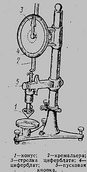 Рис.5 Прилад по ГОСТ 1440-78 для визначення пенетрації Пенетрація - показник, який виражається глибиною проникнення тіла стандартної форми (каліброваної голки) в в’язке середовище. За одиницю пенетрації прийнята глибина занурення голки на 0,1 мм. Індекс пенетрації – показник, який характеризує ступінь колоїдності тіла або відхилення його стану від чисто в’язкісного, визначається за формулою: