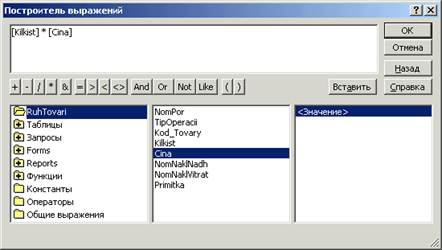 У режимі Конструктора запросов можна доповнити запит розрахунковими полямита сформованими користувачем умовами відбору окремих записів таблиць. Створивши заздалегідь запит на вибірку Рух товарів з усіма полями однойменної таблиці, слід сформувати розрахункове поле Вартість та вибрати записи для товарів, вартість партії яких перевищує 50 000 грн. Для цього: · у вікні відкритої БД до стрічки створення, обрати запит Рух товарів, натиснути кнопку Конструктор. З'явиться вікно, у верхній частині якого відображена структура таблиці Рух товарів. Нижня частина - бланк запиту - містить опис запиту в табличній формі. Кожний стовпчик у ньому відповідає одному полю. Рядки Поле та Имя таблицы мають списки, що випадають, за допомогою яких і визначають потрібні для запиту поля; · для створення розрахункового поля Вартість слід: o встановити курсор у бланку запиту після поля Ціна, вставити порожній стовпчик через пункти меню Вставка\Столбцы та натиснути піктограму Построитель выражений на панелі інструментів; o у полі Построителя выражений набрати розрахунковий вираз: =[Ціна]*[ Кількість], для цього: - вибрати в переліку полів, вибраних до запиту, поле Ціна та натиснути кнопку Вставить; - натиснути кнопку знака множення у вікні Построителя выражений; - вибрати в переліку полів запиту Кількість та натиснути кнопку Вставить; - натиснути <ОК>.