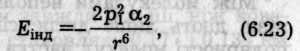 де р1 і р2 — постійні дипольні моменти взаємодіючих молекул; r — відстань між центрами диполів; k — константа Больцмана; Т — абсолютна температура. Чим полярніші молекули, тим сильніше вони притягаються і тим більша енергія орієнтаційного ефекту. З підвищенням температури ефект зменшується, бо підсилений тепловий рух порушує взаємну орієнтацію диполів. Найсильніше орієнтаційний ефект виявляється у молекул, що мають великий дипольний момент і малі розміри (Н2О, NH3). У молекул, що мають малий дипольний момент (CO) або великі розміри (SO2), орієнтаційний ефект менший, а у неполярних частинок (СО2, інертні гази) він взагалі відсутній. Індукційний ефект зумовлений дією індукованих диполів молекул, які можуть виникати в неполярних молекулах внаслідок постійного дипольного моменту сусідніх молекул (рис. 6.47, б). Взаємодія постійного диполя однієї молекули та індукованого диполя іншої спричинює зниження енергії системи з двох молекул. У свою чергу індукований диполь збільшує дипольний момент полярної молекули. Енергію взаємодії диполя з індукованим диполем обчислюють за формулою (Дебай, 1920)