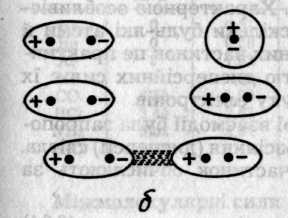 Рис. 6.47. Схематичне зображення орієнтаційного (а), індукційного (б) та дисперсійного (в) ефектів між молекулами Оскільки орієнтація наведеного диполя визначається лише напрямком постійного диполя, то енергія індукованої взаємодії не залежить від температури. Вона збільшується зі зростанням дипольного моменту й поляризованості та швидко спадає зі збільшенням відстані. Енергія індукційного ефекту в десять-двадцять разів менша від енергії орієнтаційного ефекту. Вона суттєва лише для таких молекул, які легко поляризуються. Наприклад, індукційний ефект амоніаку вищий, ніж води, оскільки поляризованість молекул NH3 більша ніж Н2О, хоч дипольний момент амоніаку менший. Під час взаємодії двох полярних молекул під дією їхніх електричних полів у них виникають додатково індуковані диполі. При цьому індукований ефект накладається на диполь-дипольний, що збільшує взаємне притягання. Дисперсійний ефект є найбільш універсальним, оскільки зумовлюється взаємодією частинок за рахунок їхніх миттєвих мікро-диполів (рис. 6.47, в), які виникають внаслідок флуктуації руху електронів і коливань ядер. Синхронна поява і зникнення мікроди-полів різних частинок супроводжується їх притяганням і зниженням енергії системи. Якщо синхронність порушується, то диполі руйнуються й частинки відштовхуються. Характерною особливістю дисперсійних сил є їх загальність, оскільки будь-які атоми й молекули мають електрони. Для неполярних частинок це практично єдине джерело сил. Іншою особливістю дисперсійних сил є їх адитивність — результат узгодженого руху електронів. Кількісна характеристика дисперсійної взаємодії була запропонована Лондоном (1930) на основі теорії розсіяння (дисперсії) світла. Енергію цієї взаємодії для однакових частинок обчислюють за формулою