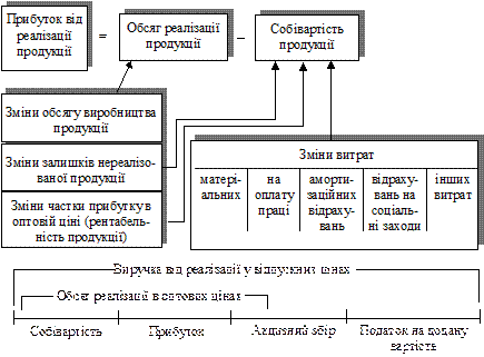 Як уже зазначалося, отримання прибутку від реалізації продукції (робіт, послуг) залежить від здійснення основної діяльності суб’єктів господарювання. Прибуток входить до складу виручки від реалізації. Однак на відміну від виручки, надходження якої на розрахунковий рахунок підприємства фіксується регулярно, обсяг отриманого прибутку визначається тільки за певний період (місяць, квартал, рік) на основі даних бухгалтерського обліку. Реально формування прибутку на підприємстві відбувається в міру реалізації продукції. Проте окремі законодавчі акти по-різному трактують настання моменту реалізації. Так, згідно із Законом «Про оподаткування прибутку підприємств» від 22 травня 1997 року, реалізацією визнається подія, що відбулася раніше: дата зарахування коштів покупця на банківський рахунок постачальника в оплату товарів або дата відвантаження товарів. Згідно із Законом «Про податок на додану вартість» від 3 квітня 1997 року (з наступними змінами до нього), реалізацією вважається зарахування коштів від покупця на банківський рахунок постачальника в оплату товарів, що підлягають реалізації. Однак незалежно від визначення моменту реалізації в законодавчих актах реальне формування на підприємстві прибутку від реалізації продукції має місце тільки за умови, коли така відбувається насправді. Тобто, коли кошти від покупця надходять на розрахунковий рахунок постачальника. Визначення моменту реалізації за датою відвантаження товарів і визначення податкових зобов’язань підприємств згідно з цією датою призводить до використання оборотних коштів підприємств на сплату податків, погіршання їхнього фінансового стану. На рис. 4.2 наведено структурно-логічну схему формування прибутку від реалізації продукції, а також названо основні показники, що впливають на прибуток від реалізації. Прибуток від реалізації продукції безпосередньо залежить від двох основних показників: обсягу реалізації продукції та її собівартості. На зміну обсягу реалізації продукції впливає зміна обсягу виробництва, залишків нереалізованої продукції, частки прибутку в ціні продукції (рентабельність продукції). Треба звернути увагу на те, що зміна обсягу виробництва, залишків нереалізованої продукції справляють вплив не тільки на обсяг реалізації продукції, а й на її собівартість, оскільки змінюються умовно-постійні витрати (за зміни обсягу виробництва продукції); витрати на зберігання продукції, інші витрати (за зміни залишків нереалізованої продукції). Істотний вплив на обсяг реалізації продукції, а також і на прибуток від реалізації справляє розмір прибутку, що включається в ціну виробів. За умов формування ринкової економіки, державного регулювання рентабельності продукції, як правило, уже нема. Отже, створюється можливість збільшення прибутку підприємства за рахунок збільшення частки прибутку в ціні окремих виробів. Цьому сприяє відсутність належної конкуренції, монопольне становище деяких підприємств у виробництві й реалізації багатьох видів продукції. Таким чином можна зробити висновок, що можливості підприємств впливати на обсяг прибутку від реалізації, змінюючи обсяги виробництва продукції, залишки нереалізованої продукції, її рентабельність є досить істотними.